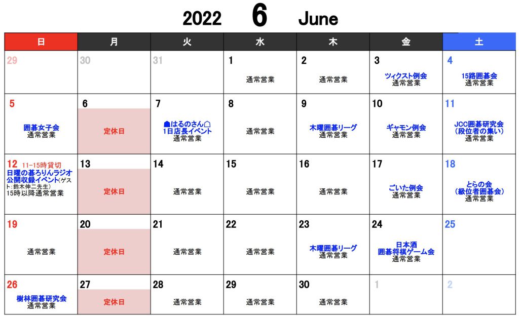 6月の休業日・貸切予定