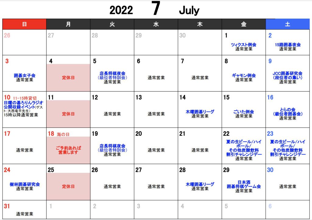 青字はイベントを開催しておりますが、通常営業もしておりますのでお気軽にご来店ください。 ご予約も可能です。 貸切(赤)となっている部分は通常のご利用ができません。ご了承くださいませ。(貸切時間帯以外は通常通りご利用いただけます。)