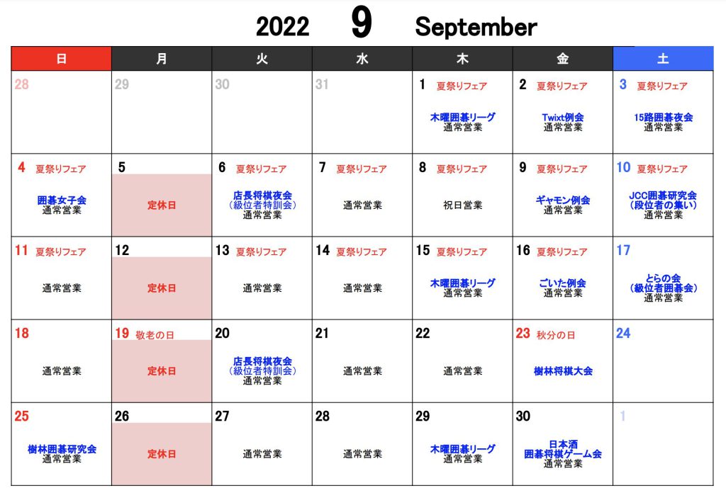 青字はイベントを開催しておりますが、通常営業もしておりますのでお気軽にご来店ください。 ご予約も可能です。 貸切(赤)となっている部分は通常のご利用ができません。ご了承くださいませ。(貸切時間帯以外は通常通りご利用いただけます。)