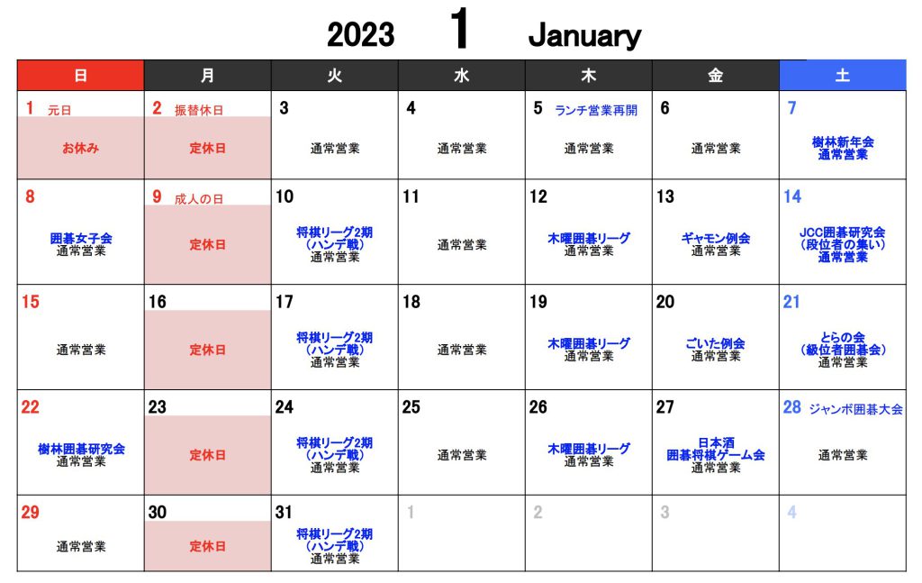 青字はイベントを開催しておりますが、通常営業もしておりますのでお気軽にご来店ください。 ご予約も可能です。 貸切(赤)となっている部分は通常のご利用ができません。ご了承くださいませ。(貸切時間帯以外は通常通りご利用いただけます。)