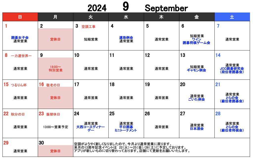 9月の休業日・貸切予定