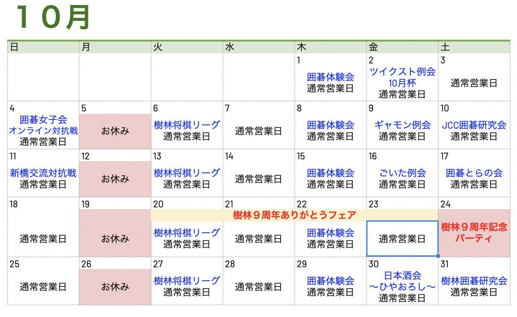 赤字は休日・貸切です。青字はイベントを開催しておりますが、通常営業もしておりますのでお気軽にご来店ください。